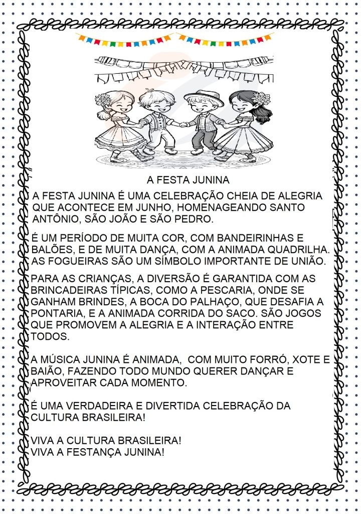 Leitura de um texto informativo ou poema junino (ex: “Capelinha de Melão”).