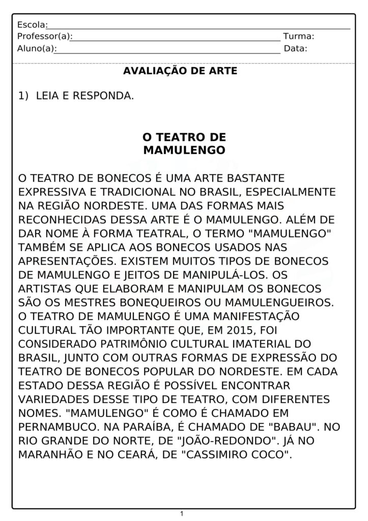 4º Ano – Avaliação Bimestral de Arte – 4º bimestre